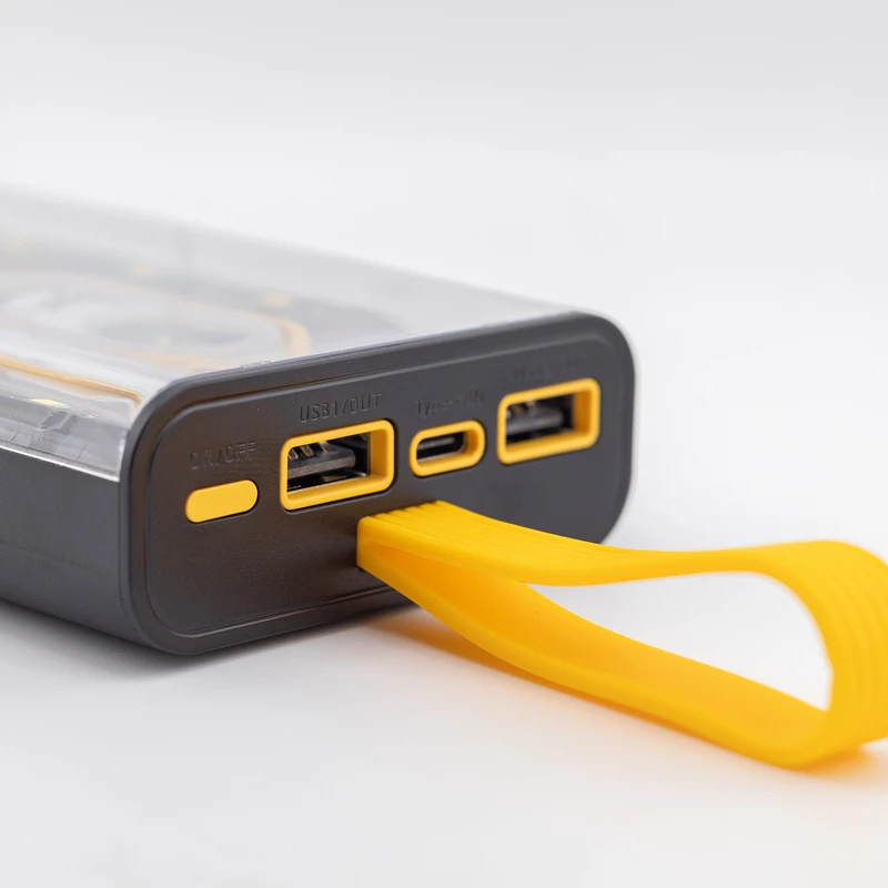 ۲ پورت خروجی USB و ۱ پورت خروجی Type-c و ۴ عدد کابل سرخود تایپ سی، یو اس بی، میکرو و لایتنینگ و چراغ LED برای روشنایی